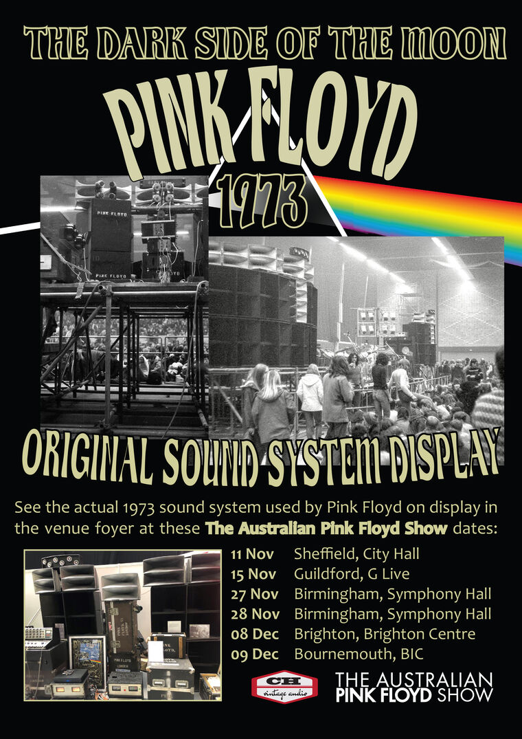 The Dark Side of the Moon, Pink Floyd 1973 original sound system will be available to see on show night! The actual 1973 sound system used by Pink Floyd will be on display in the Bourne Lounge located at the BIC for one night only.